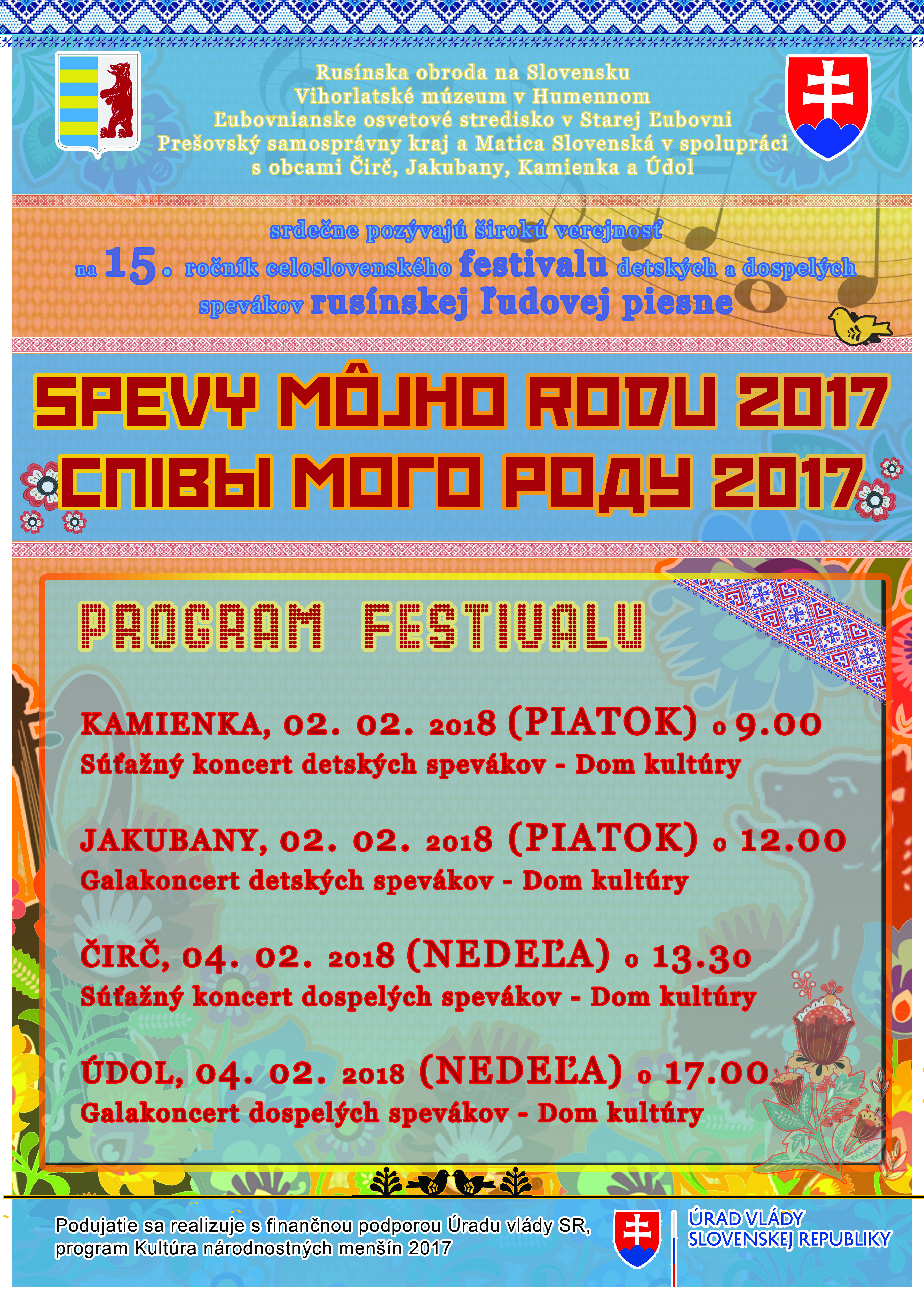 4. 2. 2018 Obec Údol bola jednou z spoluorganizátorov 15. ročníka celoslovenského festivalu detských a dospelých spevákov rusínskej ľudovej piesne " Spevy môjho rodu 2017 ".
